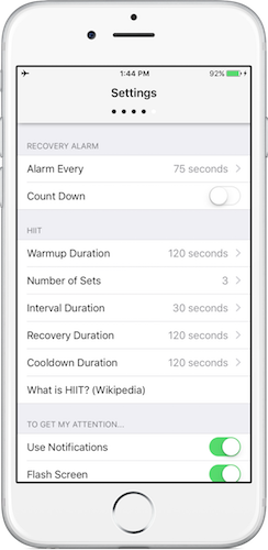 GymBrain is highly configurable though. Choose recovery duration, the type of alarm you want, countdown style and more.