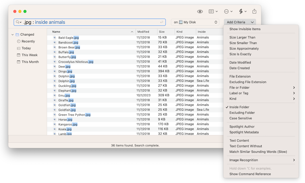 • Search by: name, creation date, modification date, file extensions, tags, parent folders, kind, regex, wildcards and spotlight Metadata.